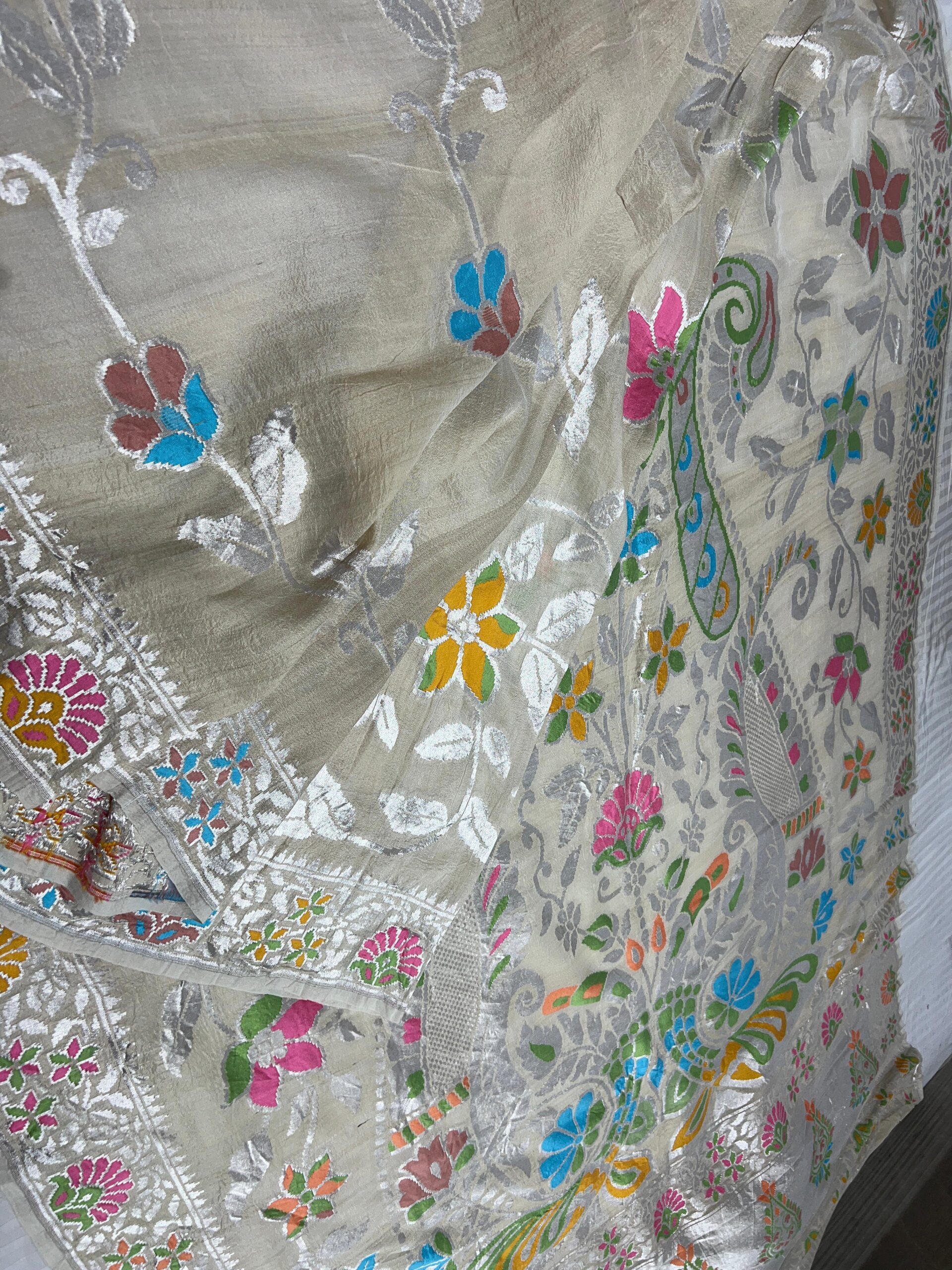 Experience the richness of tradition and luxury with our Pure Georgette Tussar Tilfi Patola Designer Saree, beautifully crafted by skilled Banarasi weavers. This masterpiece blends the finesse of georgette, the richness of tussar, and the elegance of tilfi Patola weaving, creating a truly premium designer look.