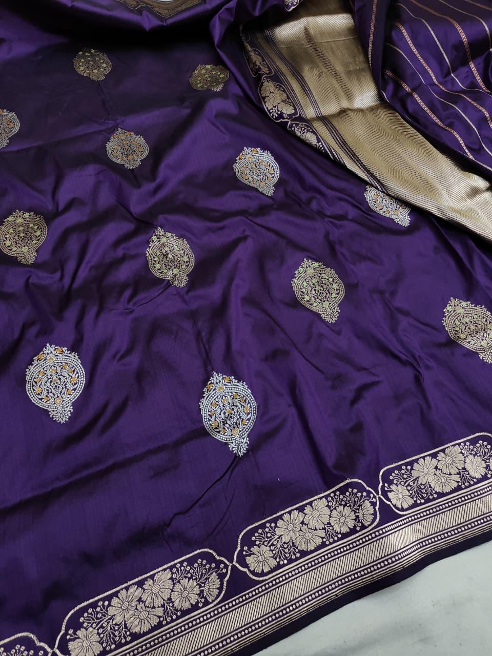 Experience the timeless grace of Banaras with our Pure Handloom Katan Silk Kadwa Booti Saree, woven meticulously by skilled artisans on traditional handlooms. Each motif (booti) is created using the Kadwa weaving technique, one of the most exclusive and intricate methods in Banarasi weaving, where motifs are woven individually— not embroidered or printed.
