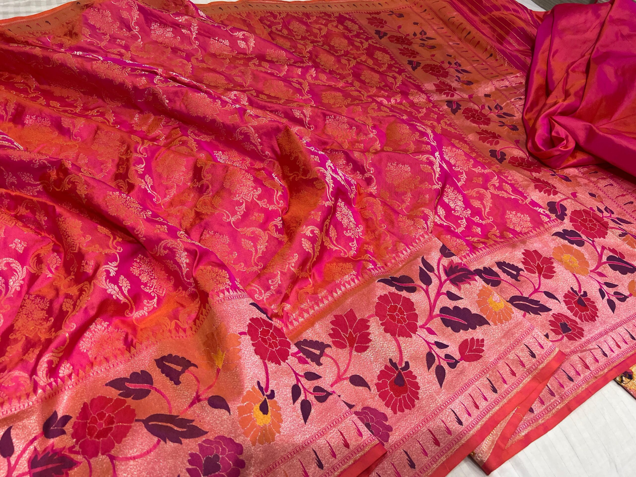 Elegant Pure Iktara Silk Handloom Saree in premium pink, featuring intricate jamdani cutwork and a traditional Paithani border. A luxurious Banarasi handloom masterpiece perfect for weddings and festive occasions.