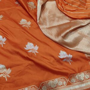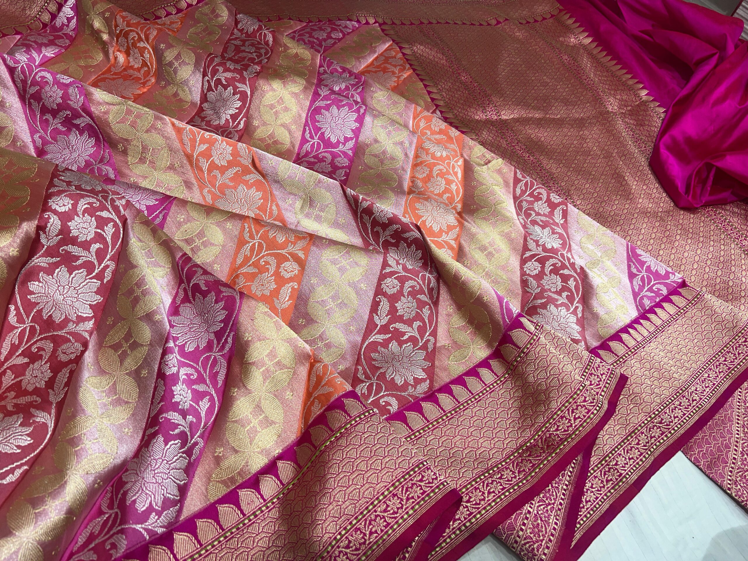 This masterpiece features the iconic Rangkat weaving, where multiple colours and patterns are skillfully merged into a single saree using traditional Banarasi handloom techniques.