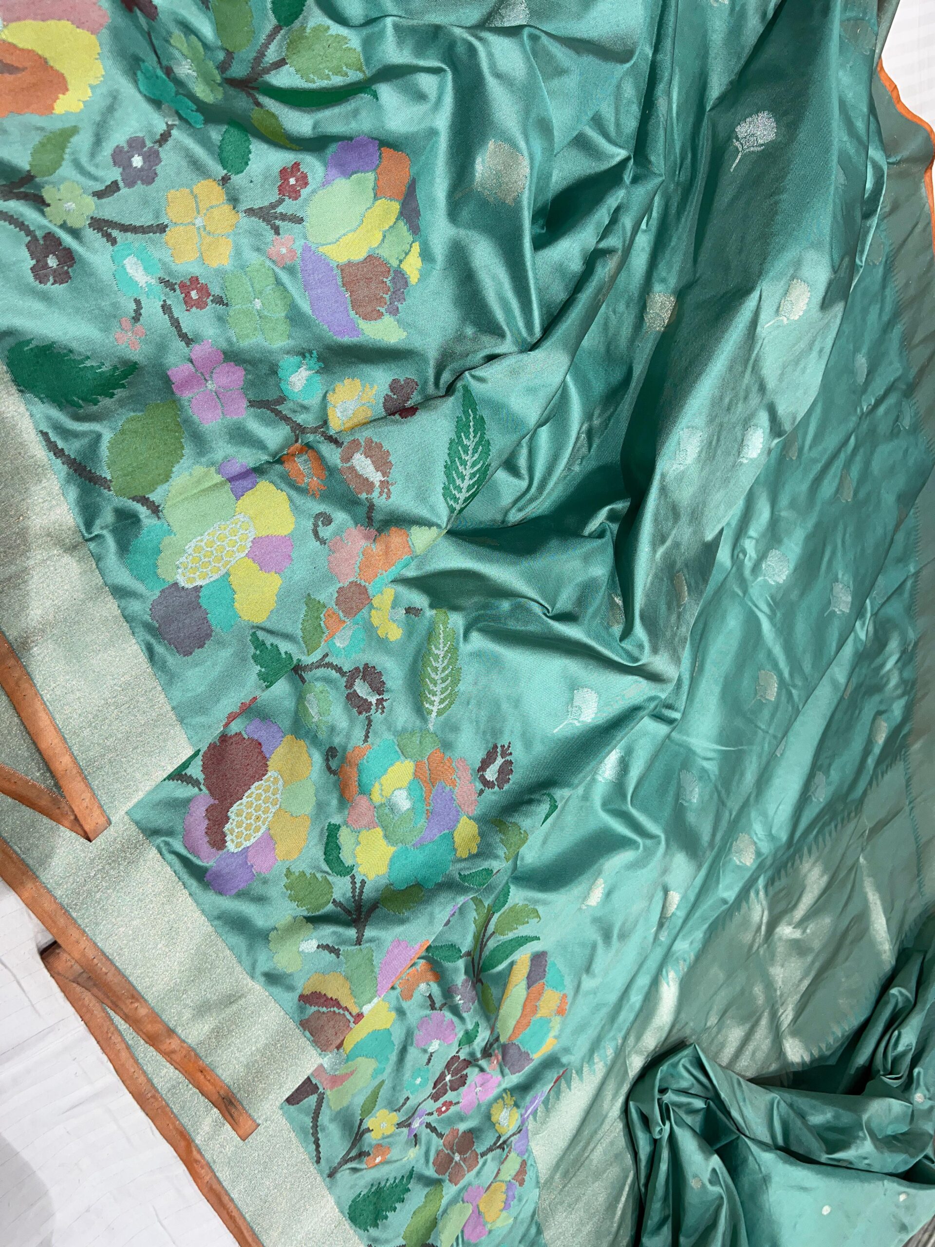 Premium Pure Silk Handloom Jamdani Skirt Buti Kadwa Saree in elegant sea blue. Handwoven with rich Kadwa weaving and Jamdani detailing, perfect for weddings and luxury occasions.