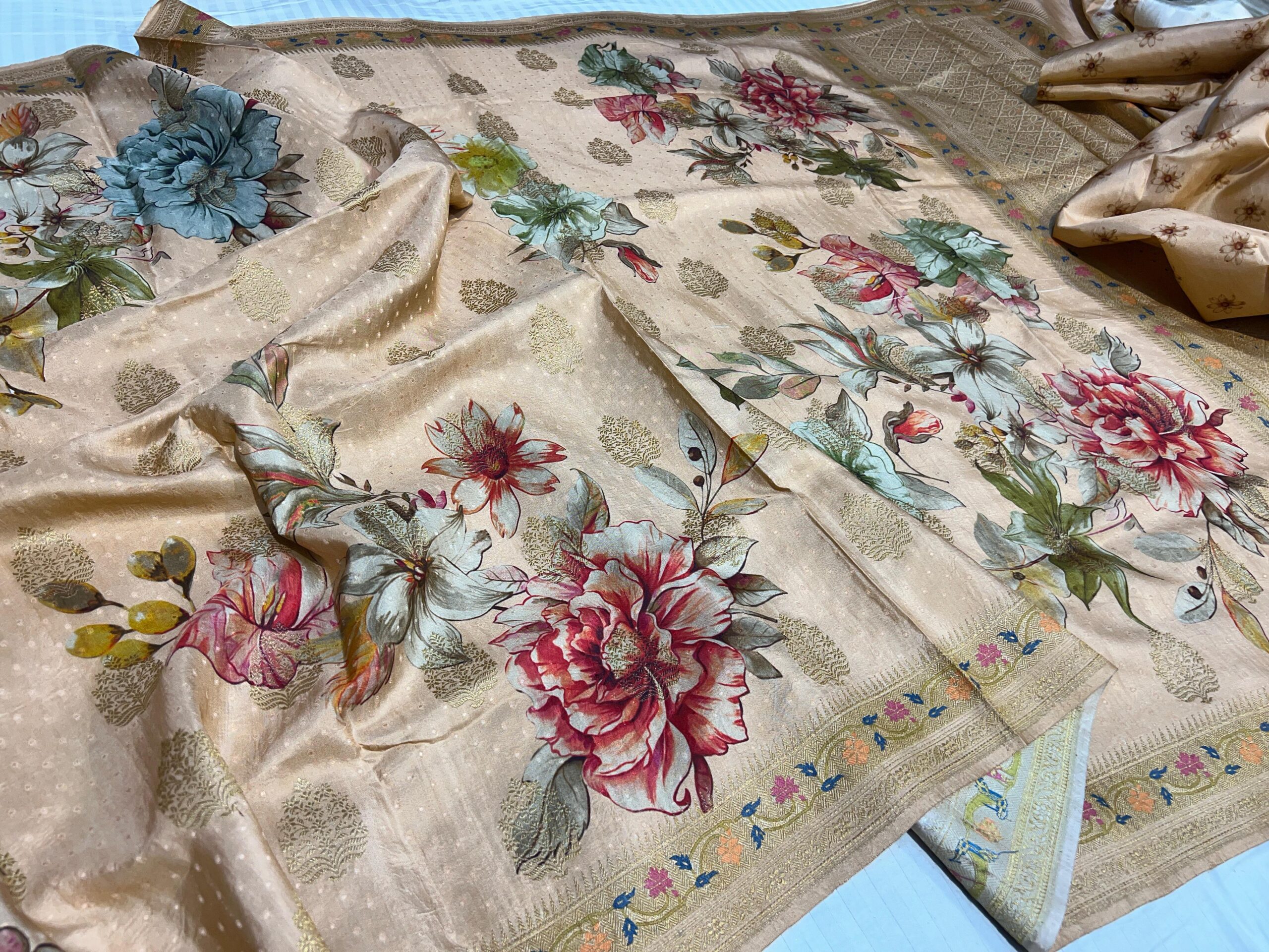 Handloom Pure Silk Katan Saree with tilfi border, regular kadwa buti, and elegant digital print detailing in a soft beige shade. A perfect fusion of tradition and modern design.