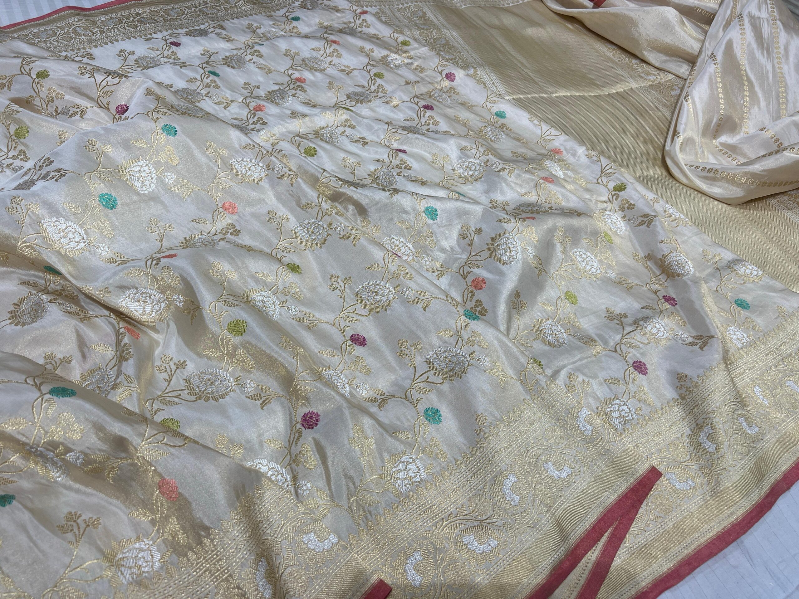 Experience luxury at its finest with this exquisite handloom Pure Silk Tissue Jungla Saree, woven in a timeless off-white shade. This saree showcases allover kadwa meenakari weaving, one of Banaras’ most intricate and premium weaving techniques, known for its depth, durability, and vibrant detailing.