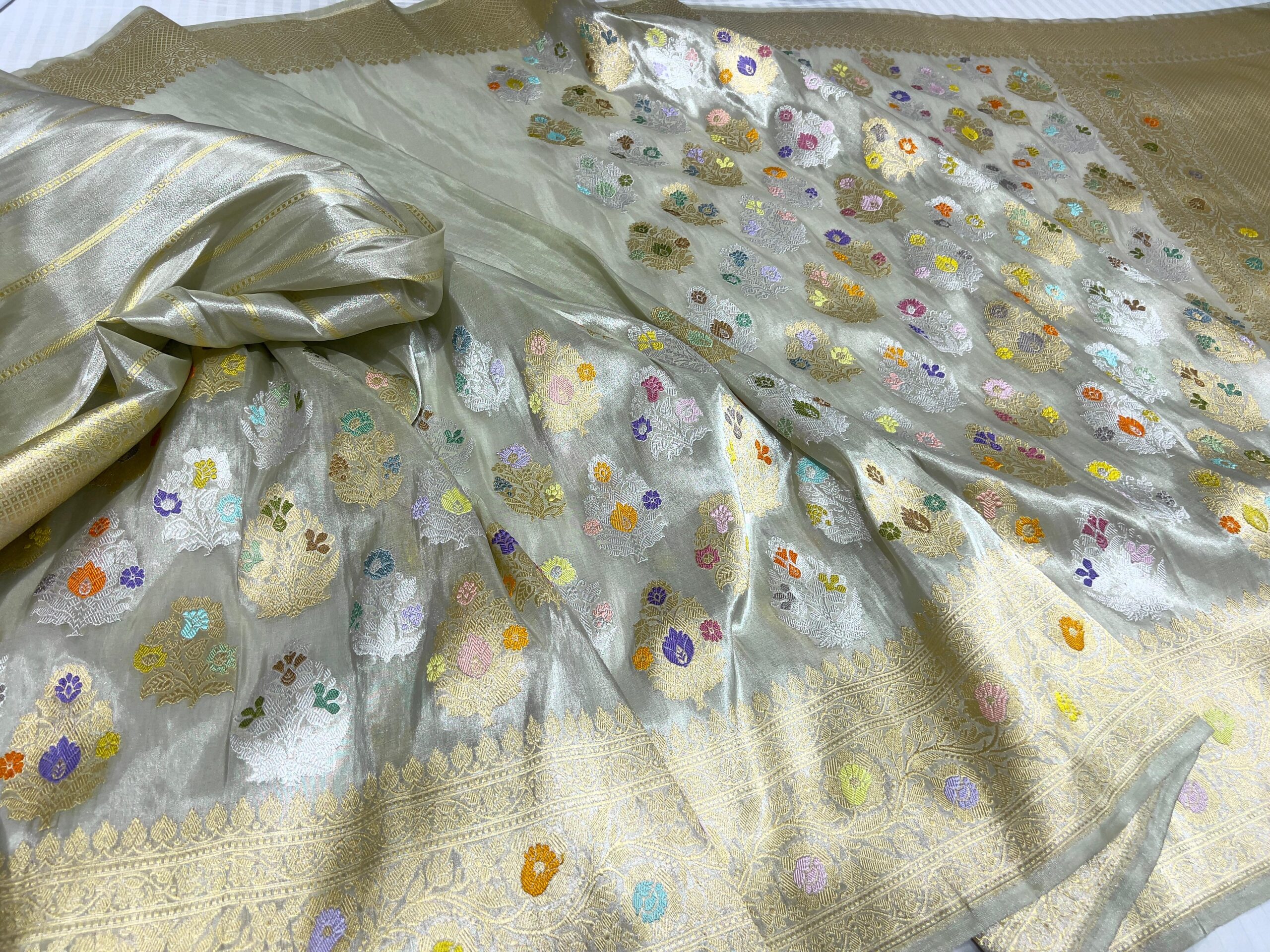 Introducing a luxurious masterpiece from Banaras — a beautifully handwoven Pure Silk Tissue Kadwa Saree in an elegant silver shade.