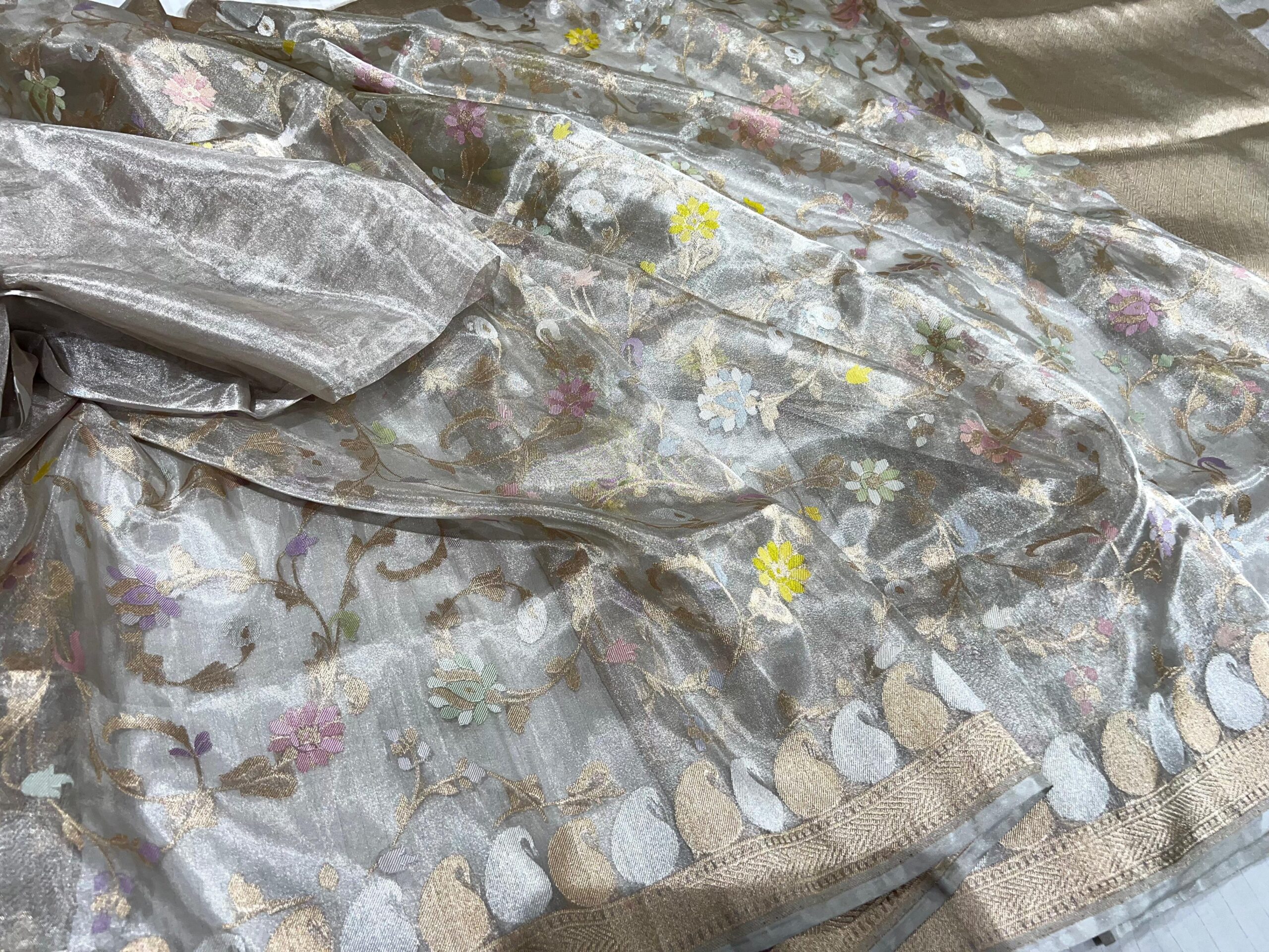 Presenting a grand and luxurious Pure Tissue-by-Tissue Allover Kadwa Tilfi Jungla Saree, woven to perfection by master Banarasi artisans.