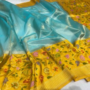 Pure Kora Tissue Kadhua Buti Saree – Sea Blue With Mustard Paithani Border & Stripe Blouse
